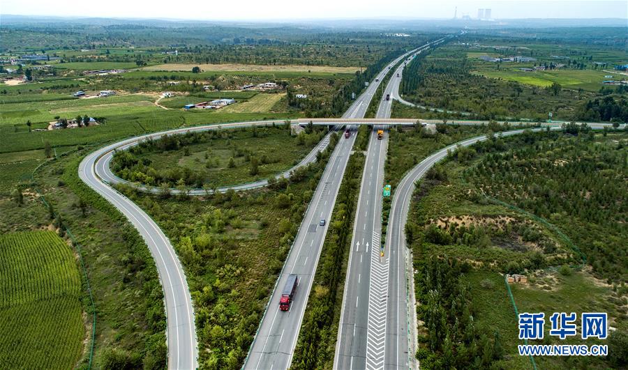 汽车行驶在榆(林)靖(边)高速公路上(8月1日无人机拍摄)。穿越毛乌素沙漠的榆靖高速,是中国建成的第一条沙漠高速公路。 新华社记者 陶明 摄