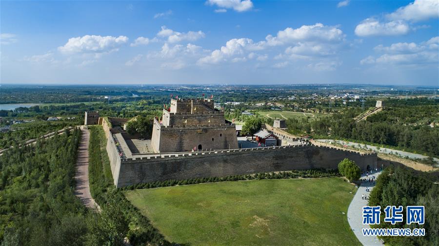 蓝天白云映衬下的榆林市镇北台(8月1日无人机拍摄)。新华社记者 陶明 摄