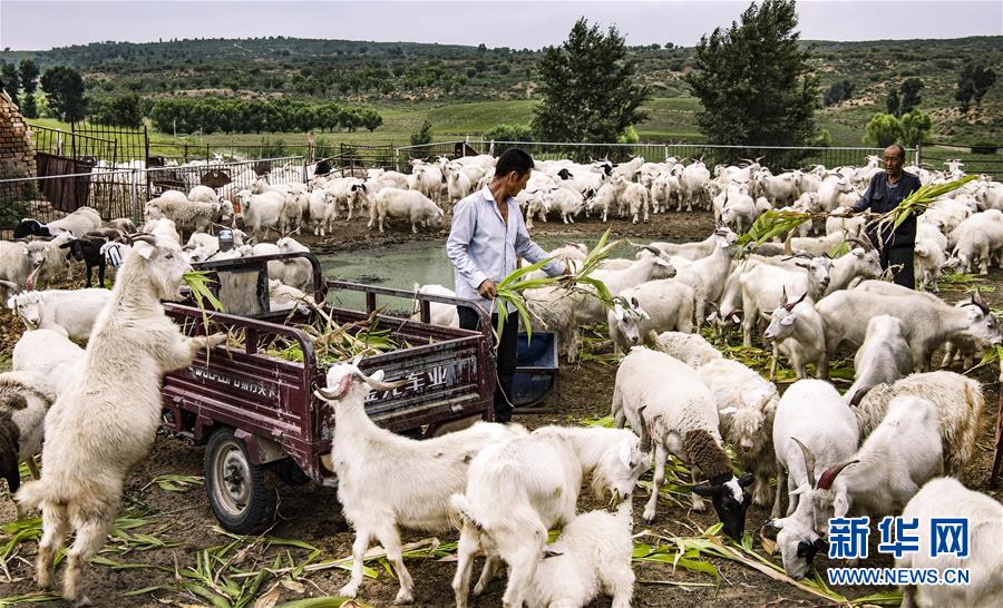 陕西榆林市靖边县红墩界镇长胜村村民在圈舍中喂羊。陕北推行的“封山禁牧,舍饲养羊”政策,有效保护了草地(8月1日摄)。新华社记者 陶明 摄