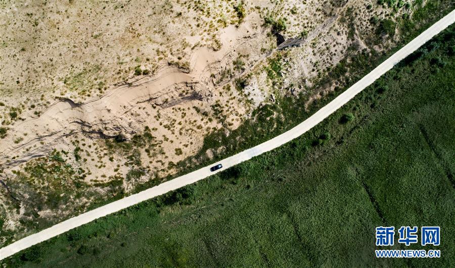 一辆汽车行驶在榆林市横山区沙漠治理与未治理的分界公路上(8月4日无人机拍摄)。新华社记者 陶明 摄