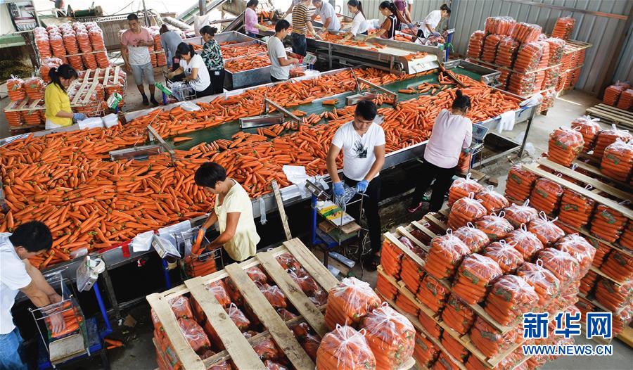 陕西省榆林市靖边县永国蔬菜种植农民专业合作社的村民们在分挑胡萝卜(7月31日摄)。靖边县利用沙土地的优势,发展蔬菜生产助村民增收。新华社记者 陶明 摄