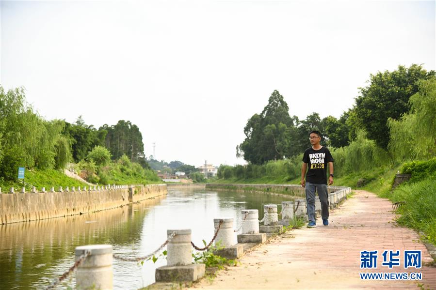 广东省鹤山市“民间河长”赵德光在桃源河畔巡河(7月12日摄)。