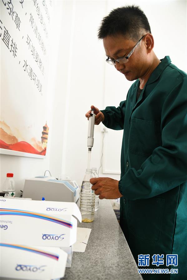 广东省鹤山市“民间河长”赵德光抽取桃源河水样(7月12日摄)。 新华社记者 邓华 摄