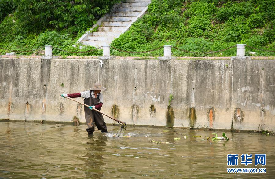 工作人员在广东省鹤山市桃源河河道清理杂物(7月12日摄)。 新华社记者 邓华 摄