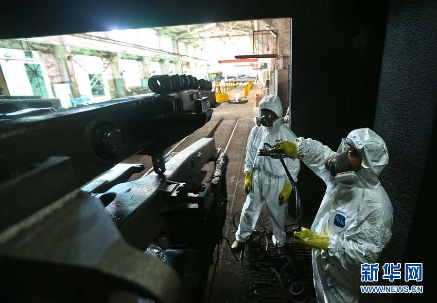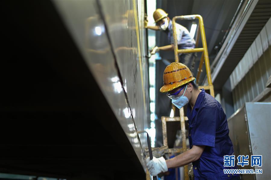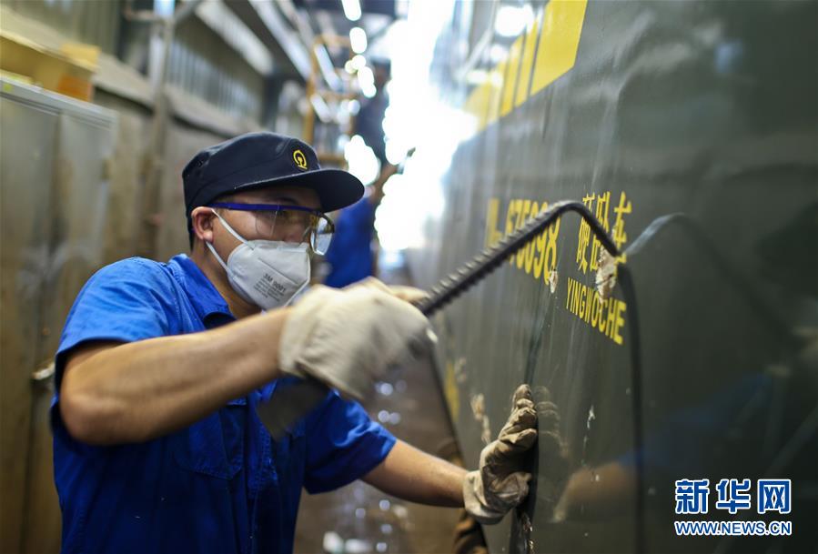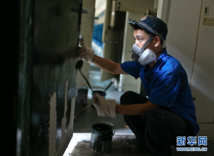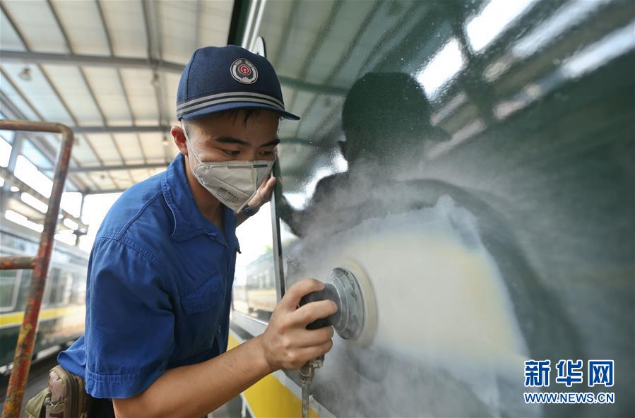 8月6日,南昌车辆段的油漆工对列车进行“美容”。新华社发(张学东 摄)