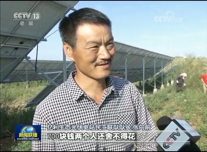 亿利生态光伏电站民工联队队长 张向前:跟我媳妇刚成家的时候,种的葵花一年卖700块钱,700块钱两个人还舍不得花,两个人把700块钱你数了他数,得数好几遍。现在好多了,现在的收入是好多个700(块钱)了。