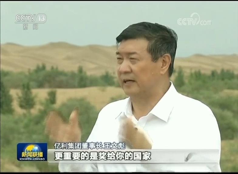 亿利集团董事长 王文彪:颁奖词一念出来,我一听,我很激动。今天这个奖励不仅是奖给库布其,更重要的是奖给你的国家。中国治理沙漠走在了世界前列,中国习近平提出的绿水青山就是金山银山影响世界。