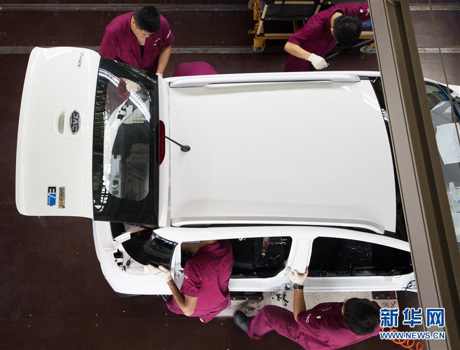 8月7日,在安徽江淮汽车集团股份有限公司安庆分公司新能源汽车总装生产线上,工人在安装一辆新能源纯电动车。江淮汽车安庆分公司是新建的一家新能源汽车生产厂家,截至2018年7月,整车销售累计已超5万辆。 作为长江经济带中承东启西、承上启下的重要节点,安徽省围绕调结构、优布局、强产业全链条,立足沿江产业基础和比较优势,转型升级,绿色发展。长江流经安徽416公里,素有“八百里皖江”之称。 新华社记者金立旺摄