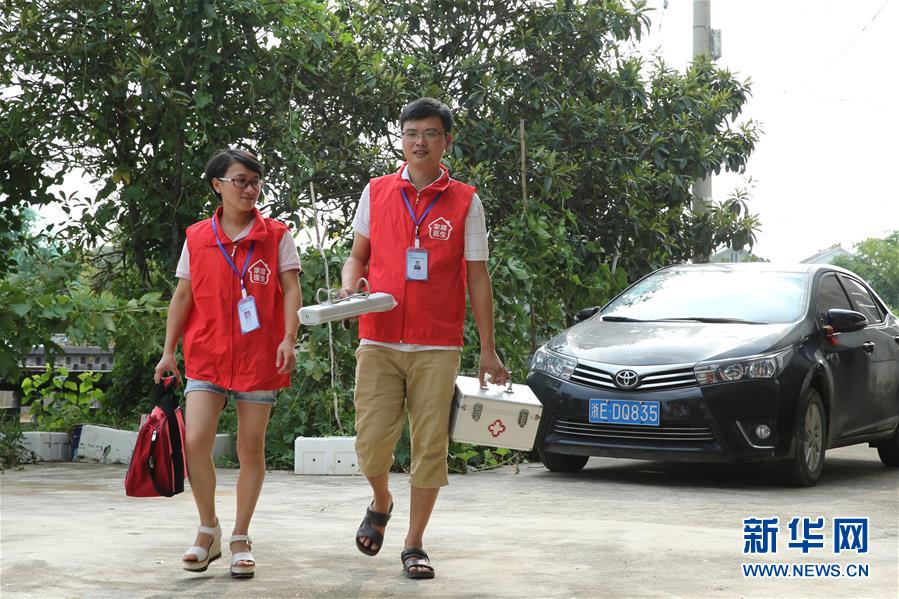 8月13日,在德清县乾元镇联合村,严红芳(左)和丈夫费云峰一起出诊。