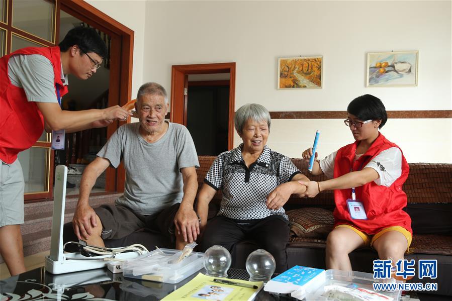 8月13日,在德清县乾元镇联合村,费云峰(左)、严红芳(右)为村民进行慢性病治疗。新华社发(倪立芳 摄)