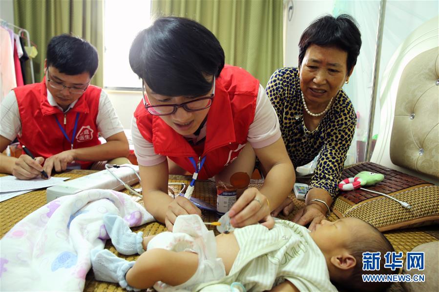 8月13日,在德清县乾元镇联合村一户村民家中,严红芳(中)给出生10天的小宝宝进行脐部护理。 新华社发(倪立芳 摄)