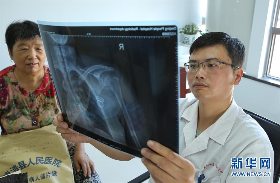 8月14日,在德清县乾元镇新区社区卫生服务站,费云峰(右)为村民李小凤查看肩关节骨折的X光片。新华社发(倪立芳 摄)