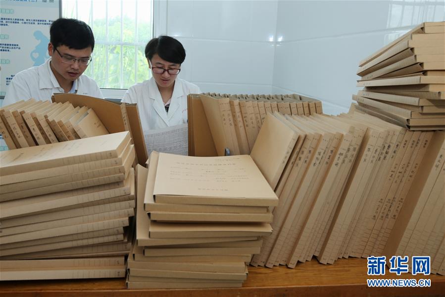 8月13日,在德清县乾元镇联合村社区卫生服务站,费云峰(左)帮助严红芳整理居民健康档案。新华社发(倪立芳 摄)