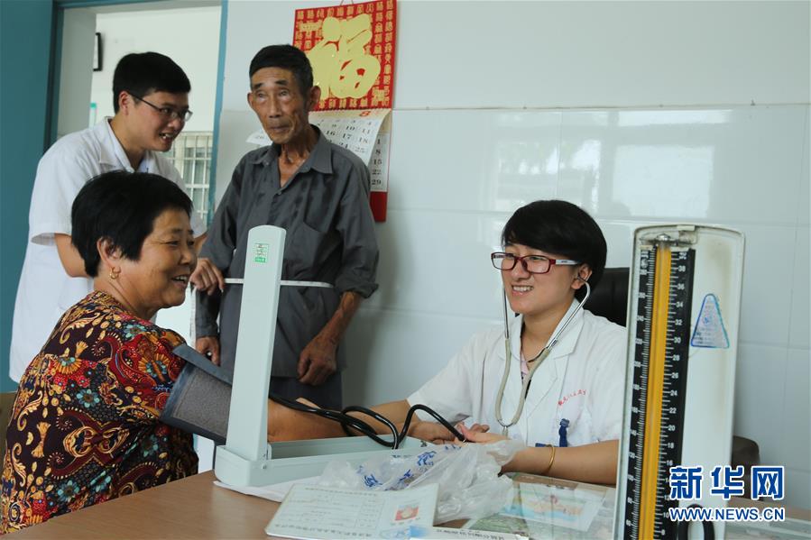 8月13日,在德清县乾元镇联合村社区卫生服务站,严红芳(右)为村民测量血压。 新华社发(倪立芳 摄)