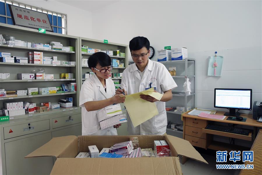8月13日,在德清县乾元镇联合村社区卫生服务站,费云峰(右)帮助严红芳进行药品入库验收。 新华社发(倪立芳 摄)