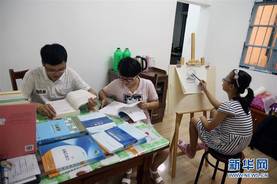 8月13日晚,在德清县乾元镇费云峰家中,费云峰夫妻在看医疗书籍“充电”,他们的孩子在旁边画画。 新华社发(倪立芳 摄)