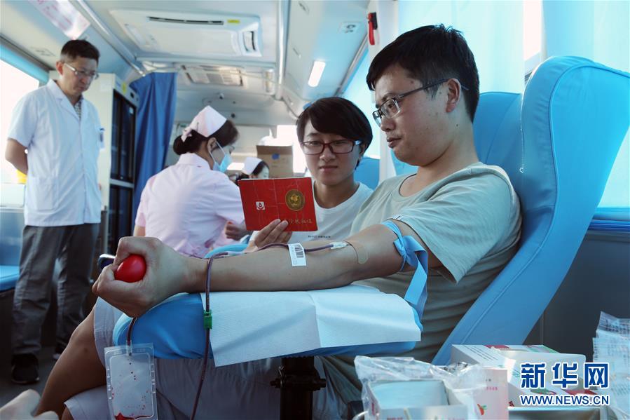 8月14日,在德清县乾元镇组织的献血活动现场,严红芳(右二)陪着费云峰献血。新华社发(倪立芳 摄)