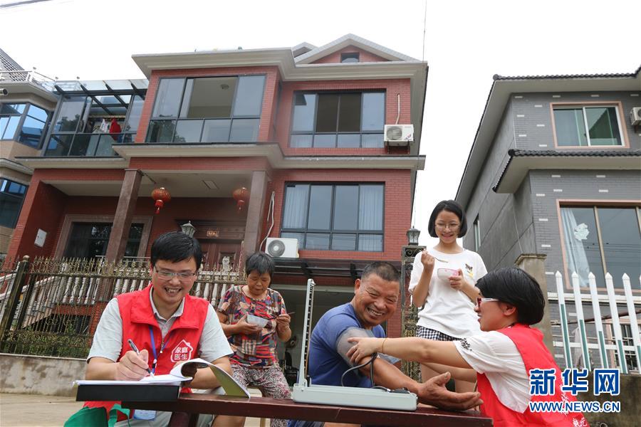 8月13日,在德清县乾元镇恒星村,费云峰(左三)、严红芳(左四)等家庭医生进行健康宣传活动。新华社发(倪立芳 摄)