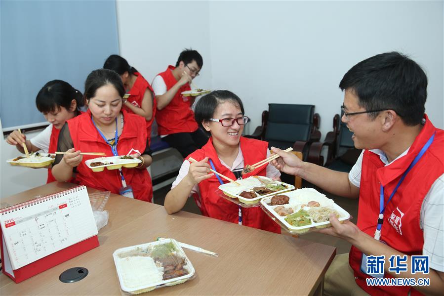 8月13日,在德清县乾元镇恒星村社区卫生服务站,费云峰(右一)、严红芳(右二)等一起用晚餐。 新华社发(倪立芳 摄)