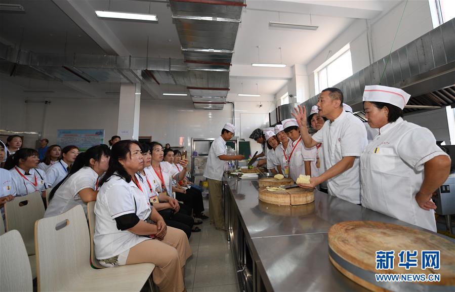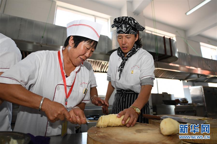8月15日,岚县社科乡阳坡村村民郭凤英(左)在培训教师郭群(右)的指导下制作土豆宴。 新华社记者杨晨光摄
