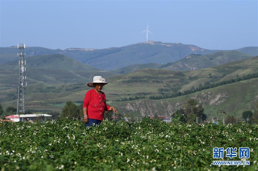 岚县河口乡王家村村民史凤英在土豆地里除草(8月14日摄)。新华社记者杨晨光摄