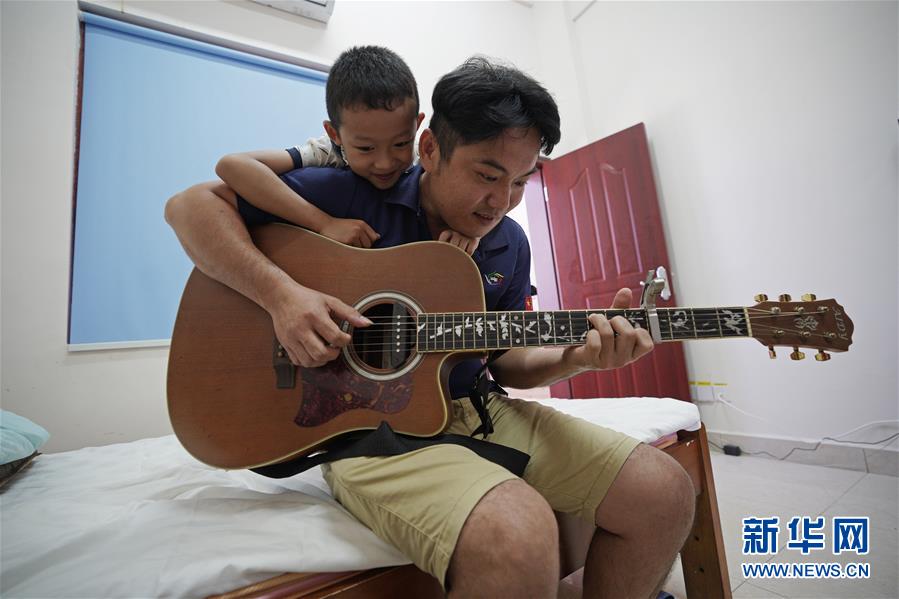 7月31日,在海南省三沙市永兴岛南方电网三沙供电局宿舍,员工陈彬为来过暑假的儿子弹奏吉他。 新华社记者 才扬 摄