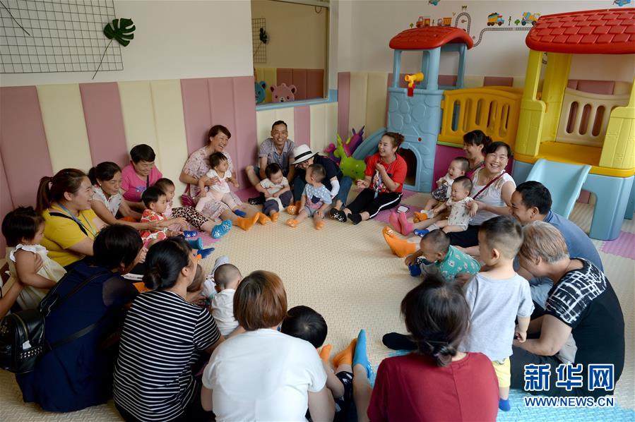8月16日,在陕西宁陕县城关镇城南儿童早期发展活动中心内,家长在养育师的带领下陪伴孩子做游戏。 新华社记者 刘潇摄