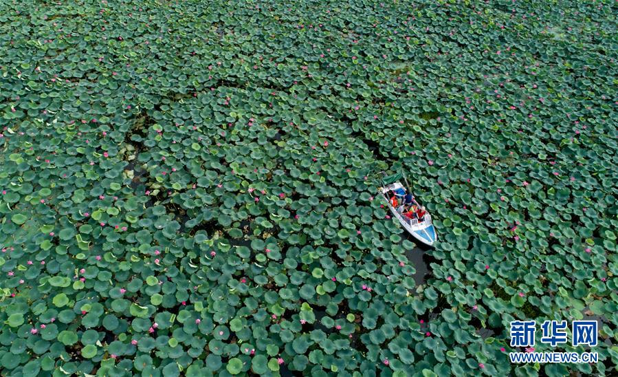 8月15日,游客在洪湖里乘船游玩(无人机拍摄)。近日,位于湖北省的洪湖湖面上荷叶田田,水鸟翱翔,景色美不胜收。洪湖是中国第七大淡水湖,过去由于大量围网养殖等原因,水质恶化,水生生态系统遭到严重破坏。2016年开始,洪湖逐步拆除围网,禁止渔业养殖,全面禁捕,对湖泊生态进行修复。如今,洪湖水质得到明显改善,“浪打浪”美景逐步重现。新华社记者 熊琦 摄
