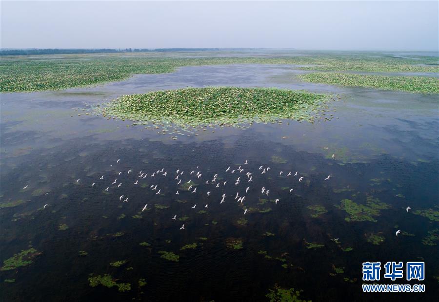 8月15日拍摄的洪湖风光。近日,位于湖北省的洪湖湖面上荷叶田田,水鸟翱翔,景色美不胜收。洪湖是中国第七大淡水湖,过去由于大量围网养殖等原因,水质恶化,水生生态系统遭到严重破坏。2016年开始,洪湖逐步拆除围网,禁止渔业养殖,全面禁捕,对湖泊生态进行修复。如今,洪湖水质得到明显改善,“浪打浪”美景逐步重现。新华社记者 隋先凯 摄