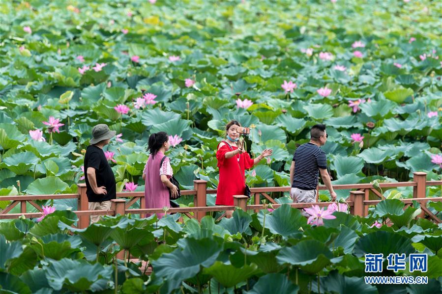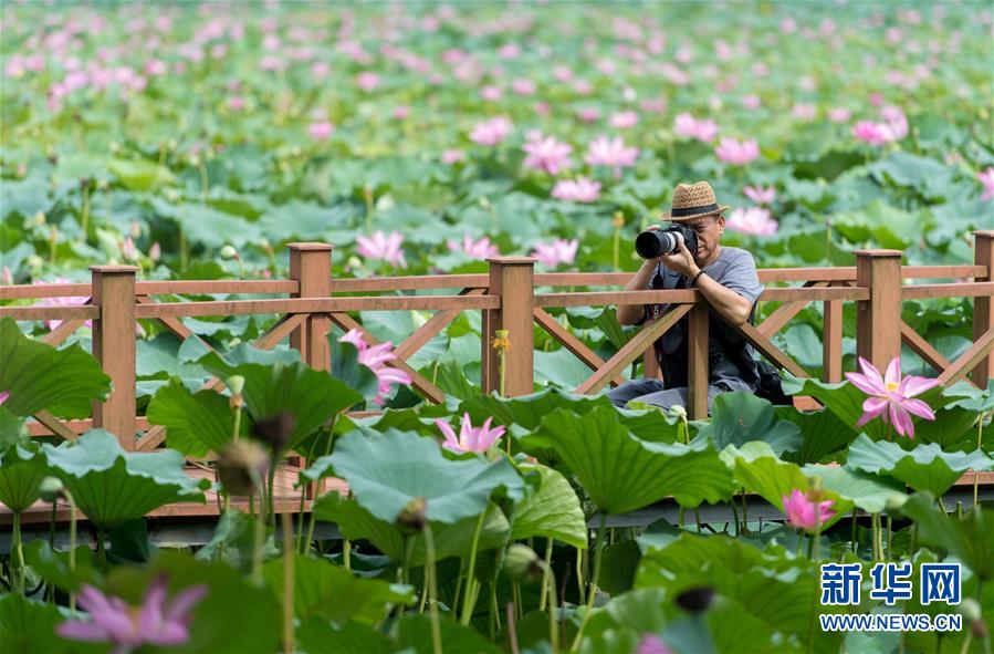 8月16日,游客在洪湖生态旅游风景区拍摄荷花。近日,位于湖北省的洪湖湖面上荷叶田田,水鸟翱翔,景色美不胜收。洪湖是中国第七大淡水湖,过去由于大量围网养殖等原因,水质恶化,水生生态系统遭到严重破坏。2016年开始,洪湖逐步拆除围网,禁止渔业养殖,全面禁捕,对湖泊生态进行修复。如今,洪湖水质得到明显改善,“浪打浪”美景逐步重现。新华社记者 熊琦 摄