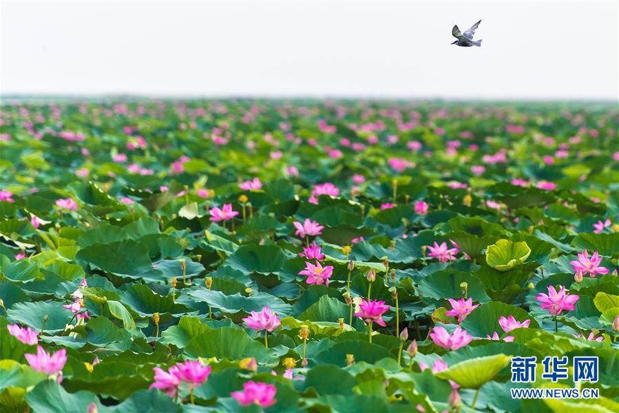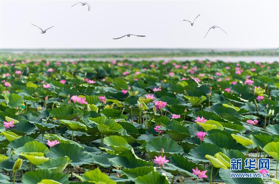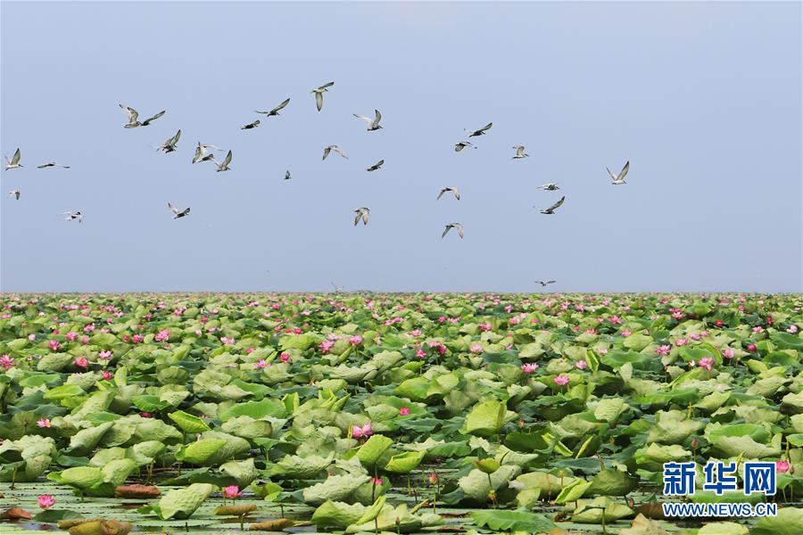 8月15日拍摄的洪湖风光。近日,位于湖北省的洪湖湖面上荷叶田田,水鸟翱翔,景色美不胜收。洪湖是中国第七大淡水湖,过去由于大量围网养殖等原因,水质恶化,水生生态系统遭到严重破坏。2016年开始,洪湖逐步拆除围网,禁止渔业养殖,全面禁捕,对湖泊生态进行修复。如今,洪湖水质得到明显改善,“浪打浪”美景逐步重现。新华社记者 熊琦 摄
