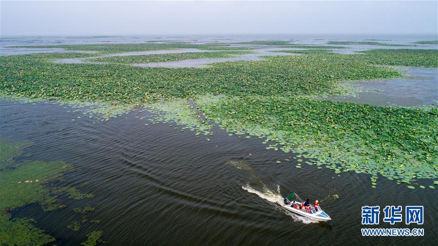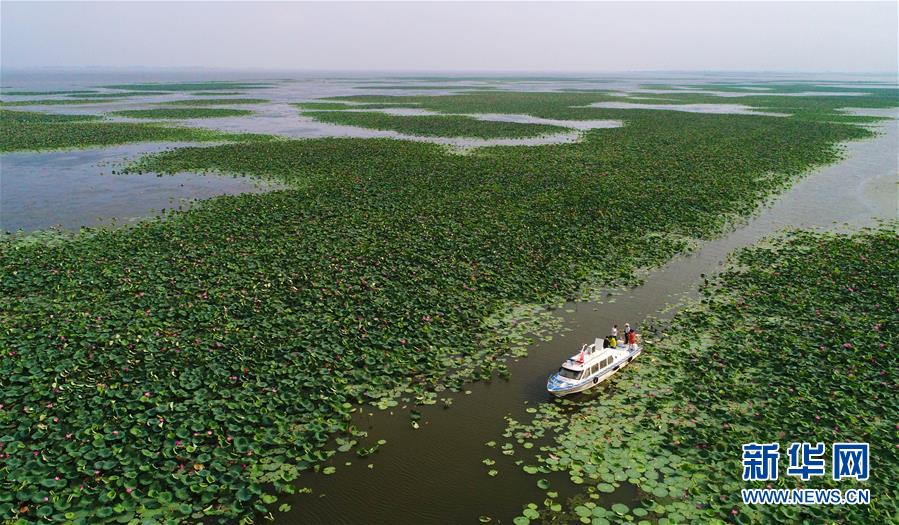 8月16日,游客在洪湖生态旅游风景区赏荷游玩。近日,位于湖北省的洪湖湖面上荷叶田田,水鸟翱翔,景色美不胜收。洪湖是中国第七大淡水湖,过去由于大量围网养殖等原因,水质恶化,水生生态系统遭到严重破坏。2016年开始,洪湖逐步拆除围网,禁止渔业养殖,全面禁捕,对湖泊生态进行修复。如今,洪湖水质得到明显改善,“浪打浪”美景逐步重现。新华社记者 王海京 摄