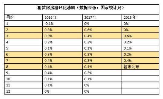 租金是CPI的重要构成部分。从国家统计局发布的数据来看,2018年7月,租赁房房租环比涨幅0.4%,同比上涨2.3%;6月租赁房房租环比涨幅0.2%。
