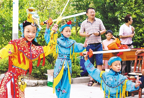 江苏省海安市经济技术开发区戏曲小票友在社区为居民表演京剧,丰富假日生活。 李晓亮摄