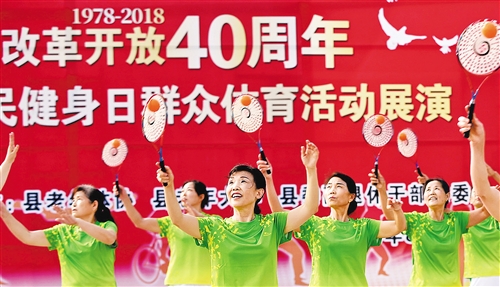 湖北省襄阳市南漳县举行群众体育活动展演。上千名干部群众分别展示了太极拳剑、健身气功、柔力球、广场舞等精彩节目,纪念改革开放40周年。 熊明银摄