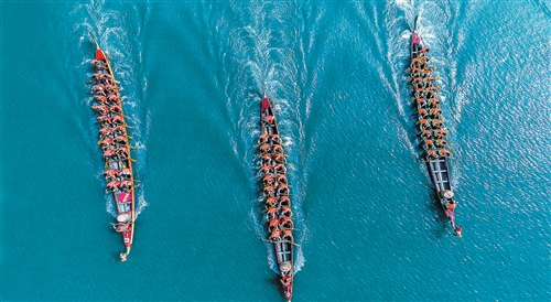 安徽省池州市举办的龙舟赛。龙舟竞渡是长江流域影响最大、流传最广的民俗之一,体现了我国悠久的历史文化传承和百舸争流、勇往直前的竞进精神。 饶 颐摄
