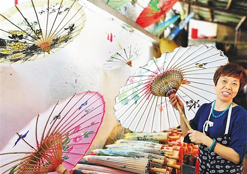贵州省赤水市大同古镇,油纸伞传人李珍霞在展示她制作的油纸伞。大同古镇历史悠久,拥有“独竹漂”、竹编、油纸伞等非物质文化遗产。 经济日报-中国经济网记者 周明阳摄