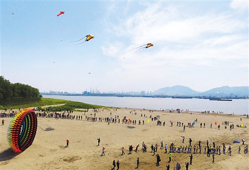 安徽省铜陵市义安区老洲乡长江岸边市民和游客在放风筝。近年来,铜陵市挖掘长江文化元素,打造老洲长江沙滩风筝旅游节、大通古镇长江龙舟赛等特色长江旅游文化项目。 过仕宁摄