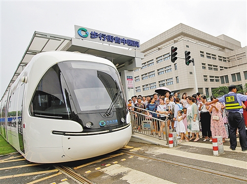 湖北省武汉市省中医院门口,乘客在等待有轨电车。近年来,当地把地铁、有轨电车、公交车和出租车站点安排在离医院近的地方,让百姓方便就医。 郑传海摄