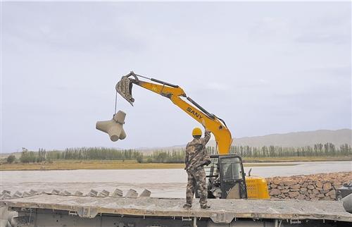 于2015年8月开工建设的黄河二期防洪(中卫段)工程建成后,将建设标准化堤防156.89公里,建设控导工程37处,新建加固各类坝垛329座、砌护护岸17.29公里,治理河段46.6公里,进一步完善了黄河中卫段防洪工程体系,基本形成以堤防为主、河道整治工程相配套的黄河防洪体系,使黄河中卫市沙坡头区段堤防设防标准达到了20年一遇。图为工程施工现场。