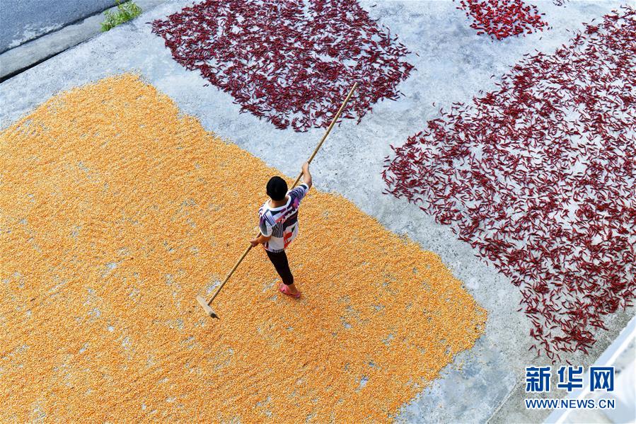 眼下,在贵州省遵义市各地农村,村民们把收获的红辣椒、玉米等铺放在房前屋后进行晾晒,构成一幅幅美丽的“晒秋图”。