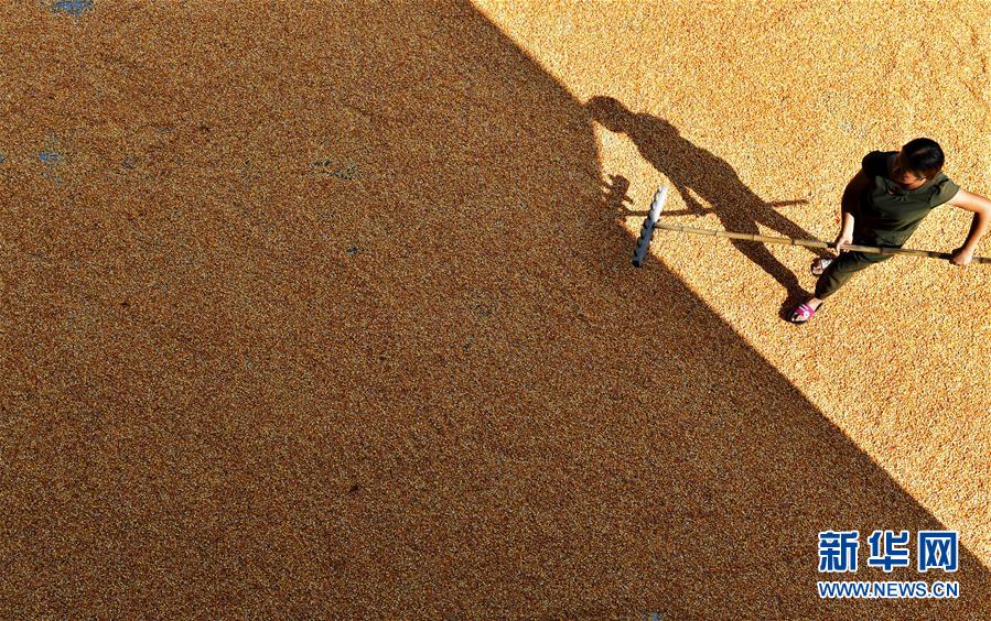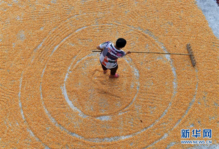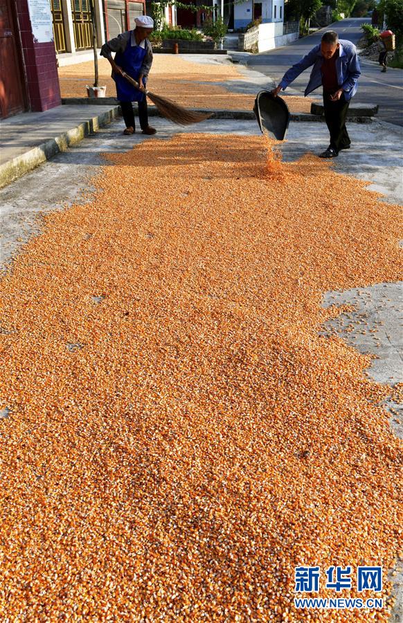 8月26日,贵州省遵义市凤冈县土溪镇石桥村村民在晾晒玉米。 新华社发(罗星汉 摄)