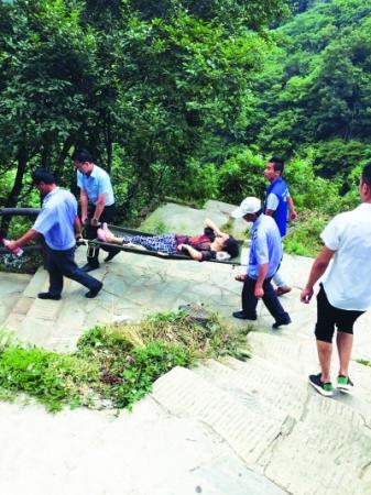 今年7月,一位六旬婆婆游玩时突发低血糖,木兰天池员工紧急抬婆婆下山就医。景区供图