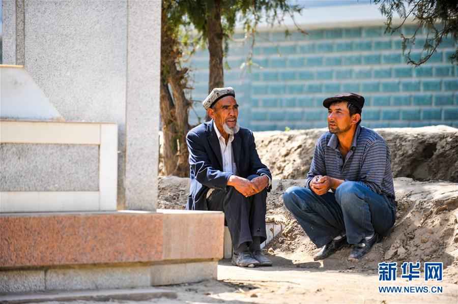 艾买尔·依提的儿子艾尼瓦尔·艾买尔(前左一)向村民们讲述战斗英雄的事迹(8月15日摄) 新华社记者 段敏夫摄