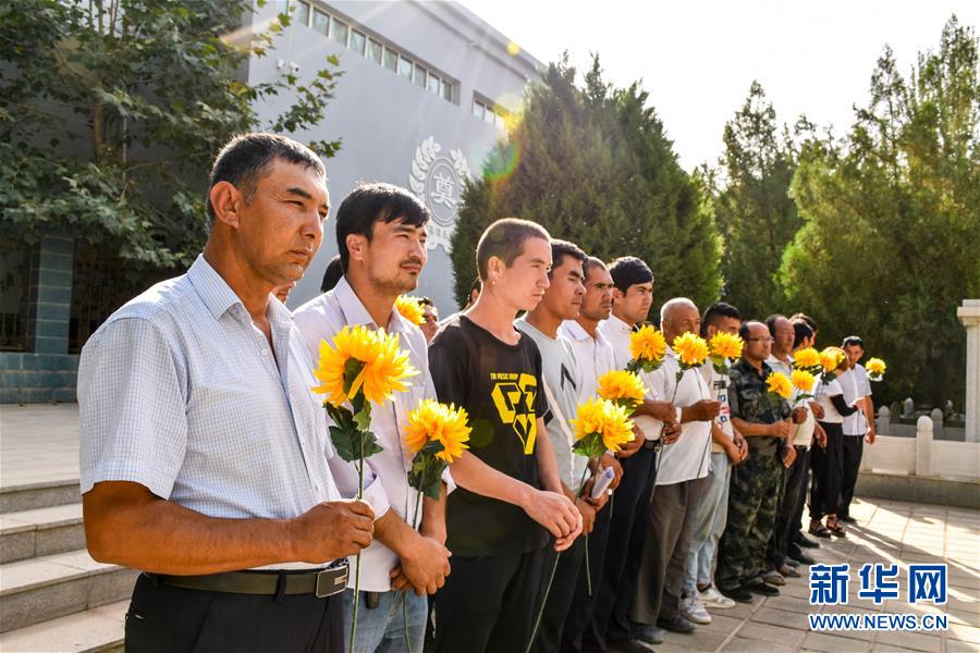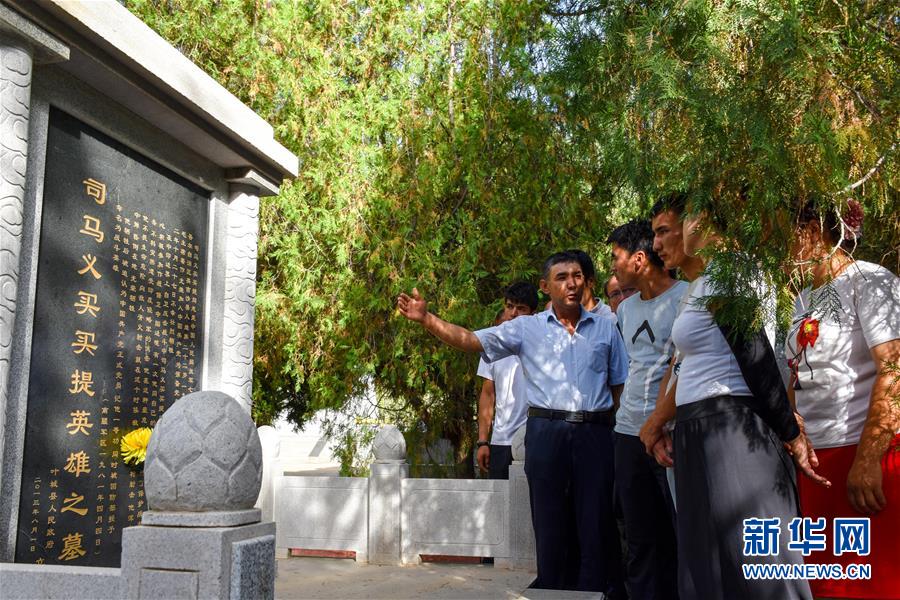 艾买尔·依提的儿子艾尼瓦尔·艾买尔(左一)和当地村民向烈士们献花(8月15日摄)。新华社记者 段敏夫摄