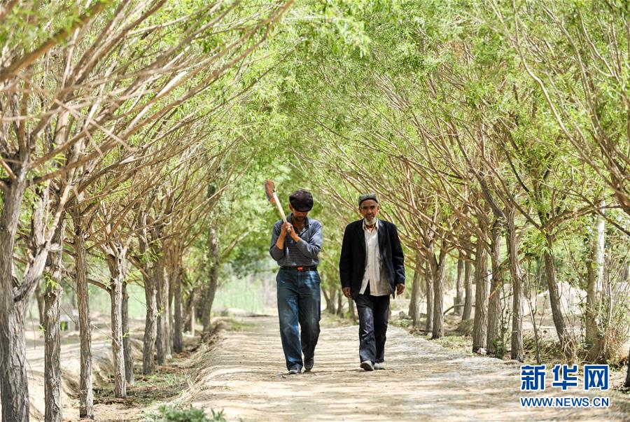 艾买尔·依提的儿子艾尼瓦尔·艾买尔(中)和两个孩子走在烈士陵园的林荫道上(8月16日摄)新华社记者 顾煜摄