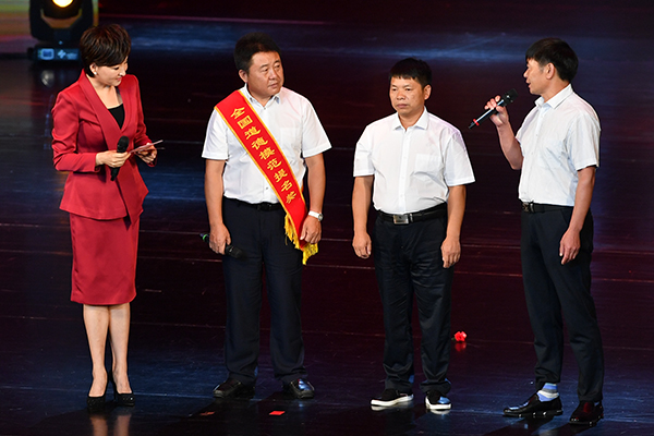 中央文明办在贵州省六盘水市举办全国道德模范与身边好人现场交流活动,并发布8月“中国好人榜”,图为全国道德模范向身边好人颁发道德传家宝。