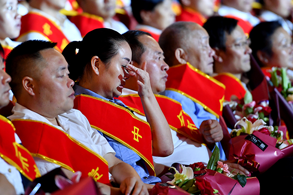 中央文明办在贵州省六盘水市举办全国道德模范与身边好人现场交流活动,并发布8月“中国好人榜”,图为现场观众感动落泪。