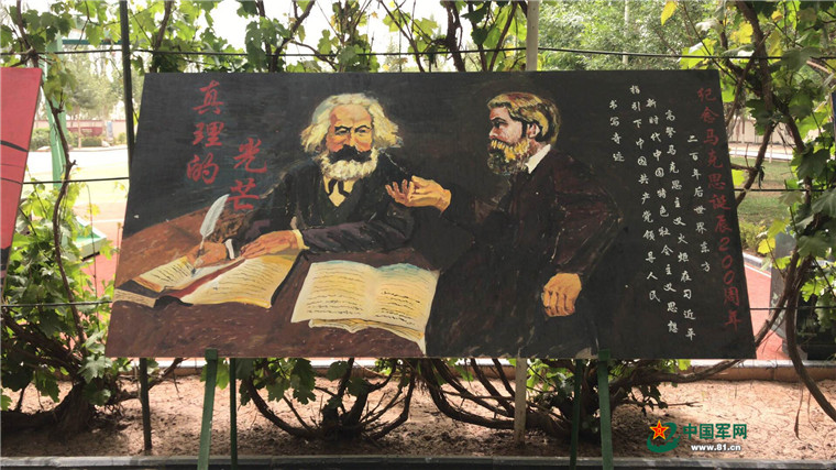 在中队营区的围墙上,10块墙画格外醒目。从《共产党宣言》发表到习近平新时代中国特色社会主义思想的提出,都在这里得到了生动的展现。我们都在猜想这可能是某位专业画家的大作,可让人想不到的是,这些画的作者是一名后勤兵,名叫张堂堂。在张堂堂眼里,学画是一件孤单而又丰富的事,孤单的是常常一个人一只笔,丰富的是有无穷的画面和万千的色彩。张堂堂时常一个人去看阳光,从构图到色彩,刚开始的时候,很难分清哪些相融哪些排斥,经常一个人深夜提笔,别人不太理解,身边也没有可以帮助的人,刚开始,他胡乱地画,胡乱地描,后来上网找教程跟着学,在营区内,有一间低矮的废弃平房,张堂堂经常带着他的笔在里面临摹,一次次失败后,总会有一次成功。终于,墙画满了,张堂堂也成了个名副其实的“小画家”。这次,接到画画任务以后,他一鼓作气,用了一晚上的时间一气呵成。第二天,瞪着熬红了的眼睛继续执勤。