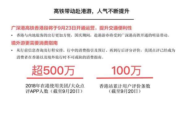 大数据显示,2018年内地消费者赴港游较上一年已经出现较大提升。截至9月20日,今年共有超过500万用户在香港当地使用了美团App或大众点评App,目前为止香港站拥有累计百万条用户评价,丰富的商家信息和用户评价将为赴港游人气不断飙升提供助力。